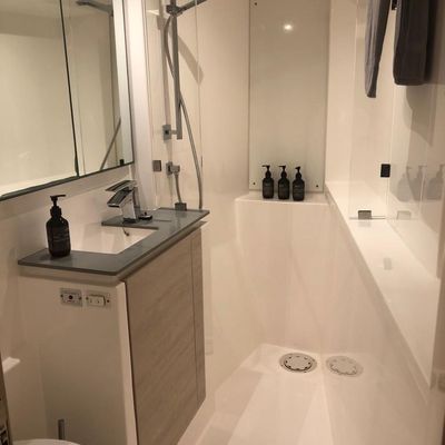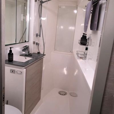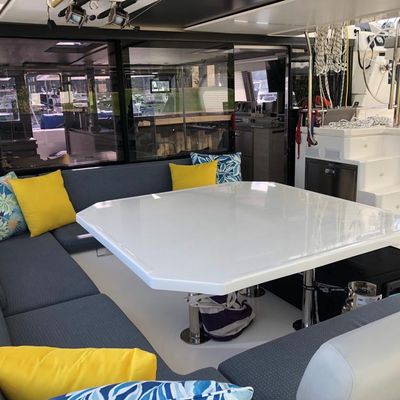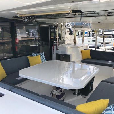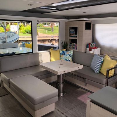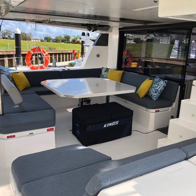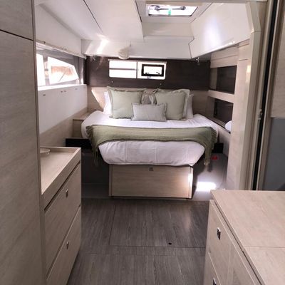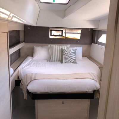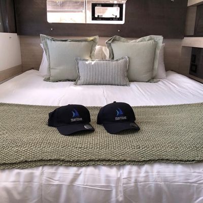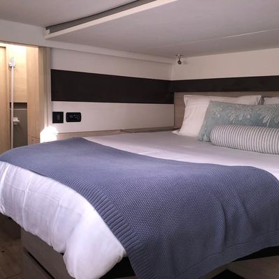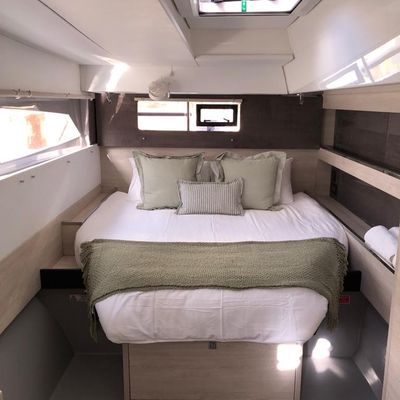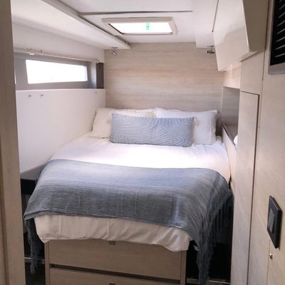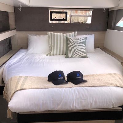 Aqua Fox accommodates up to 10 guests in four spacious cabins – 1 master cabin plus 3 double cabins all with ensuite bathrooms. The lounge in the saloon converts to a double bed to accommodate 2 people. She has all the amenities and features you would expect from a luxury catamaran: air conditioning throughout, Starlink high speed internet, generator, solar panels, water maker, audio-visual systems as well as two fridges and a freezer to ensure plenty of space for your food and drinks.