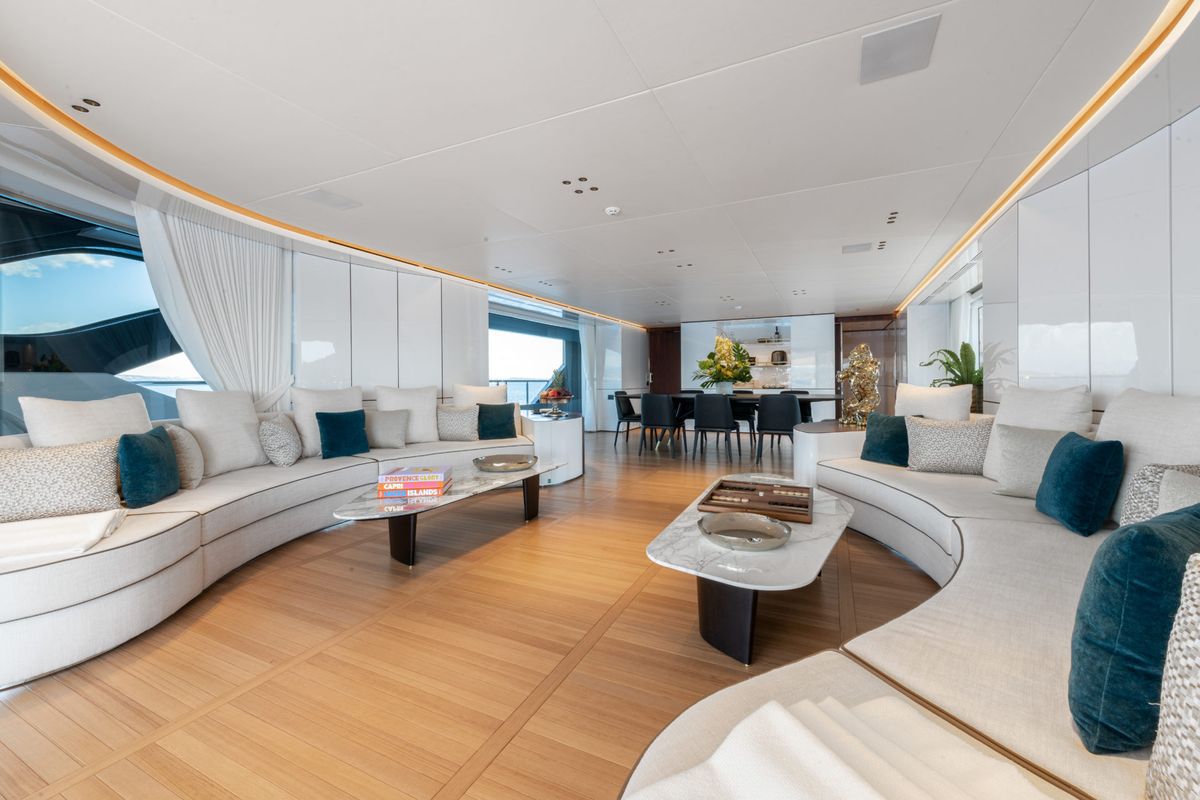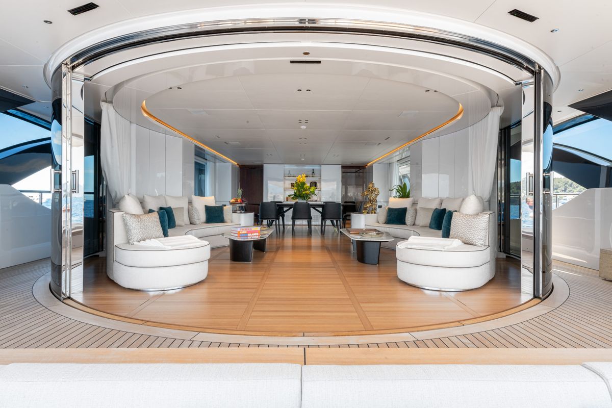 The main deck is a standout feature of NORTHERN ESCAPE, designed to set the stage for an unforgettable charter. The open aft deck seamlessly integrates a U-shaped sofa, sun loungers, daybeds, a teppanyaki bar, and an infinity pool, all perfectly connected to the sea. Adding to the allure, the swim platform features fold-down sea-level terraces, creating an exceptional beach club experience. The fold out platforms enhance versatility, offering effortless water access when lowered or transforming into a diving platform when raised.