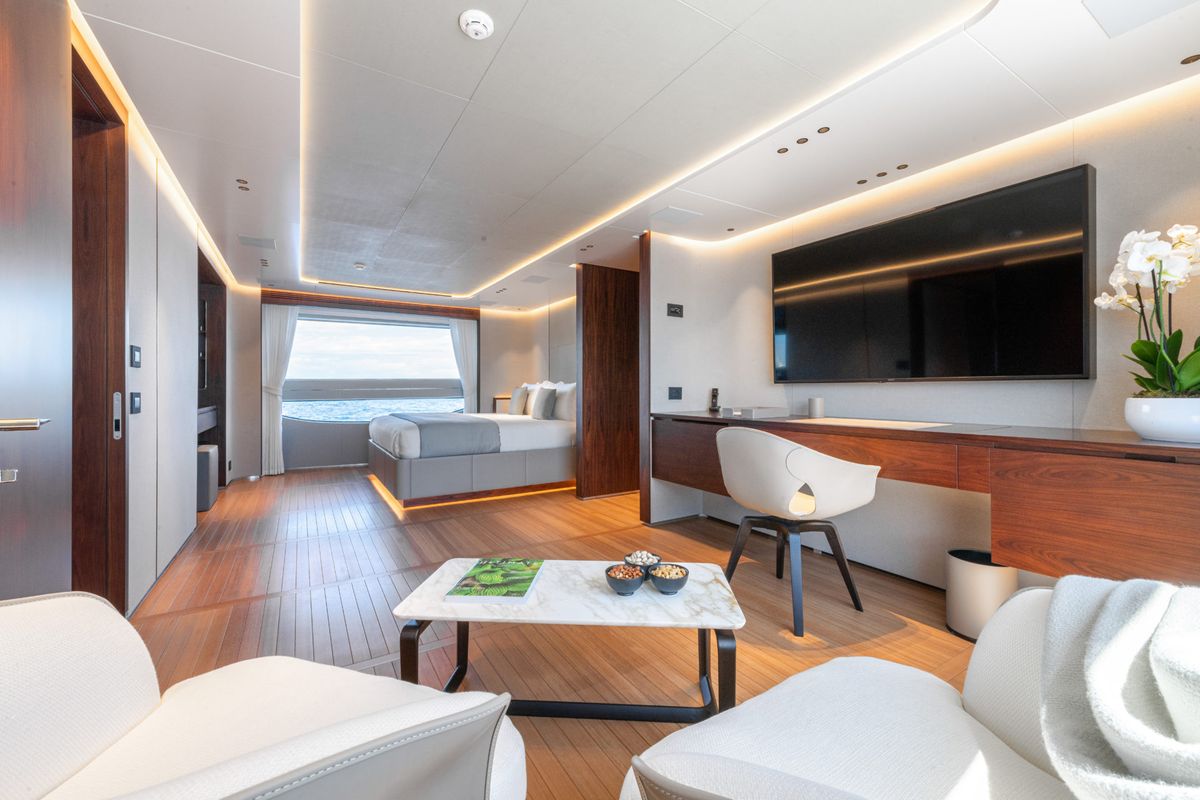 NORTHERN ESCAPE can accommodate up to 12 guests in a flexible five or six cabin layout, including a main-deck full-beam master suite with an office area, dressing rooms and his and her bathrooms. An additional room on the main deck provides even greater flexibility, with two fold-down pullman beds that can serve as an extra guest cabin or be converted into a wellness room for ultimate relaxation. The rest of the accommodation is on the lower deck and includes two double cabins, and two twin convertibles with additional Pullman beds.